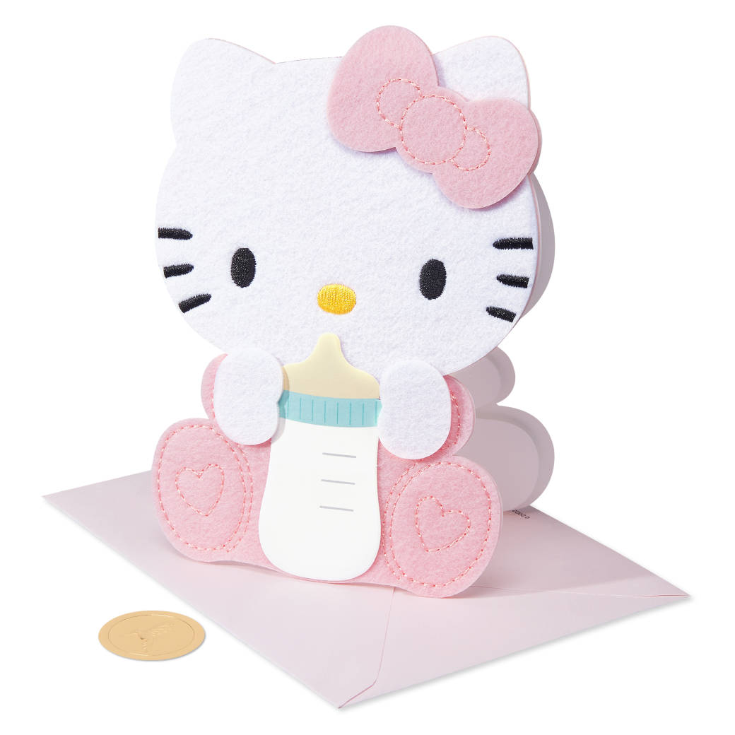 Say hello to the new baby with this “Hello Kitty” Baby Girl Card, only from Papyrus! This adorable card features a contour die-cut design of Hello Kitty. Wearing a pink bow and holding her baby bottle, Hello Kitty could not be any sweeter. Embellished with layered felt attachments and complemented with a loving message, this card is sure to add even more happiness to the new baby’s family. Make this special moment even more joyful with this premium card from Papyrus. Perfect for family, friend, co-worker, neighbor, or any Hello Kitty fan celebrating the arrival of a new baby. Premium lined envelope with unique Papyrus gold seal included.