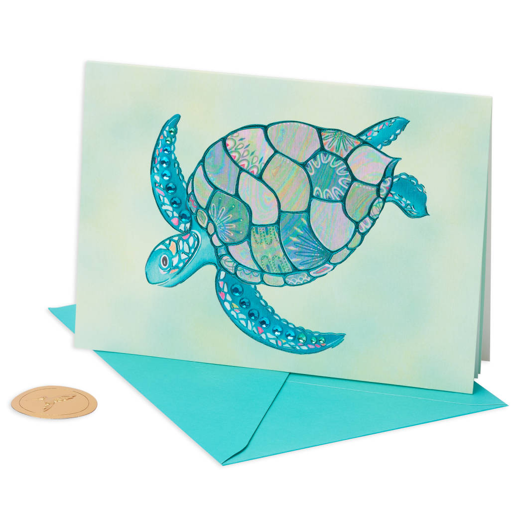A wonderful turtle with a mosaic patterned shell is the feature for this unique card from Papyrus. Striking details include fresh aquatic hues, shimmery rainbow-tinted and teal foils and assorted gems in ocean tones. This 5 x 7″ card features a light aqua insert sheet left blank for your message. Comes with a coordinating teal envelope with pearl mosaic liner, gold Papyrus hummingbird seal and a protective cello sleeve.