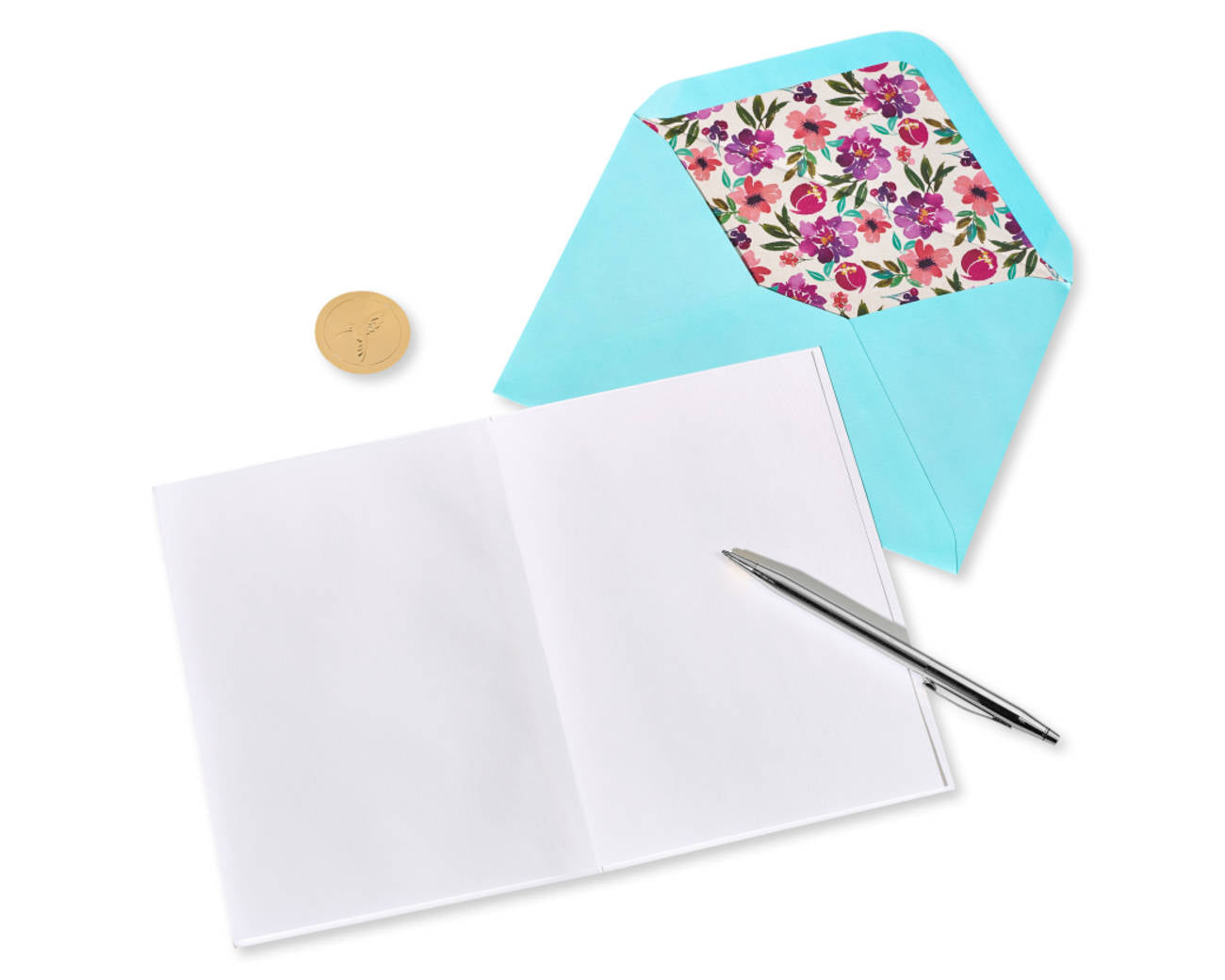 When you want to show all the gratitude in your heart, nothing does the job quite like a premium thank-you card from Papyrus. This gorgeous design features an image of an on-trend hoop wreath wrapped in multi-colored flowers with colorful brushstrokes that add movement and interest to the design. Extra finishes include metallic foil, jewels, premium paper stock, and layered paper attachments. The inside is left blank for your personal message. It’s a perfect way to say thanks to someone who makes a difference in your day, your event, or your life. Includes blue envelope with floral lining that coordinates with the card and gold seal.