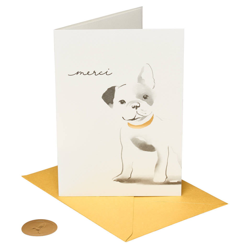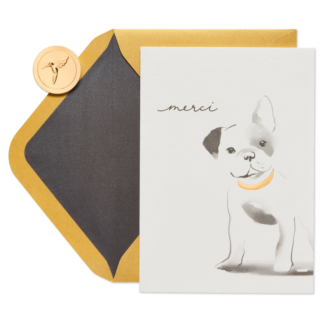 Share thanks in style with a handcrafted card from Papyrus! Created in collaboration with artist Mateja Kovac, this thank-you card features a cutely illustrated French bulldog and shimmering foil embellishments. Inside the blank greeting card is space to write a personal message. With exquisite artistry and attention to detail, Papyrus thank-you blank greeting cards offer premium looks for all the special people in your life!