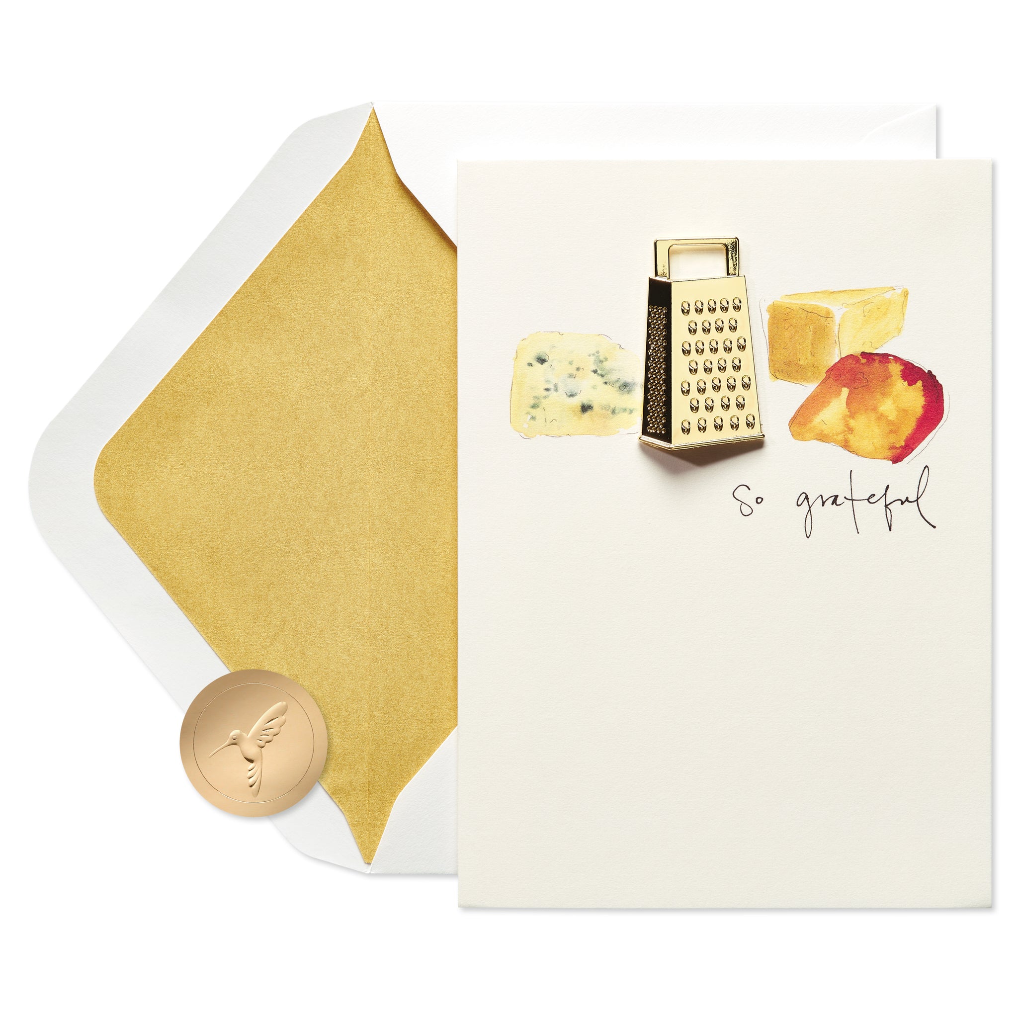 Give them the kind of thank you that they’ll always remember with this witty thank you card exclusively from Papyrus. Featuring a cheese grater and watercolor cheeses, this premium quality thank you card is sure to make them smile. The inside is blank, so there is more than enough room to add your own little personal touch.