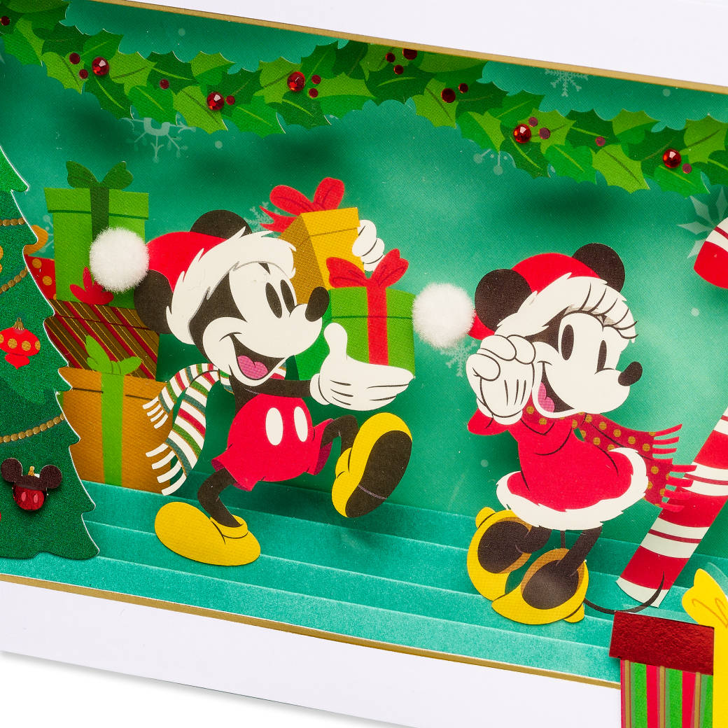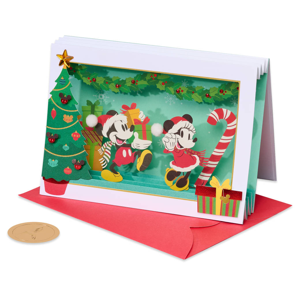 Delight every Disney lover you know with this handmade Mickey Mouse Christmas card, only from Papyrus! This Papyrus Christmas card features the beloved Mickey and Minnie Mouse decorating for the holidays in a shadowbox design. This joyful Christmas scene is embellished with gems, layered paper attachments, and metallic foil. With the warm holiday message inside, this card is perfect for anyone of any age! Premium red envelope with Mickey Mouse Christmas lining and unique Papyrus gold seal included.