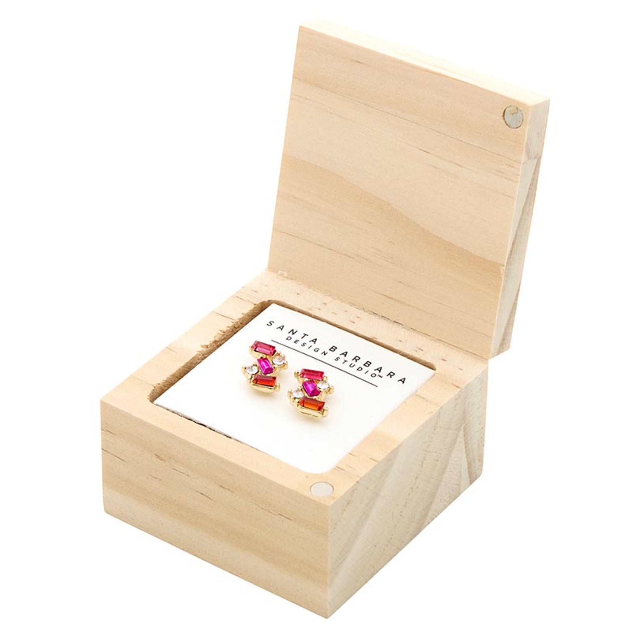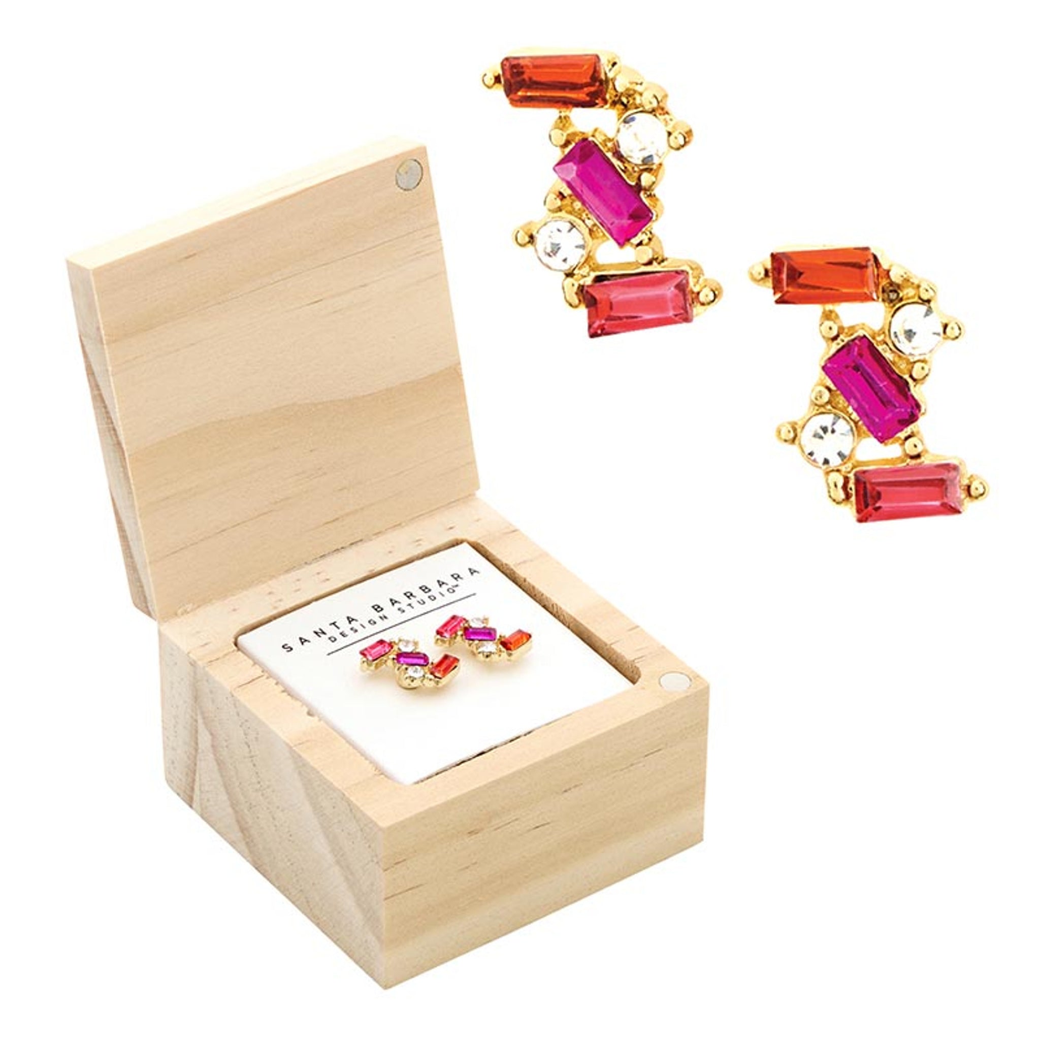 - This packaged earring and box set has a colorful crystal surprise